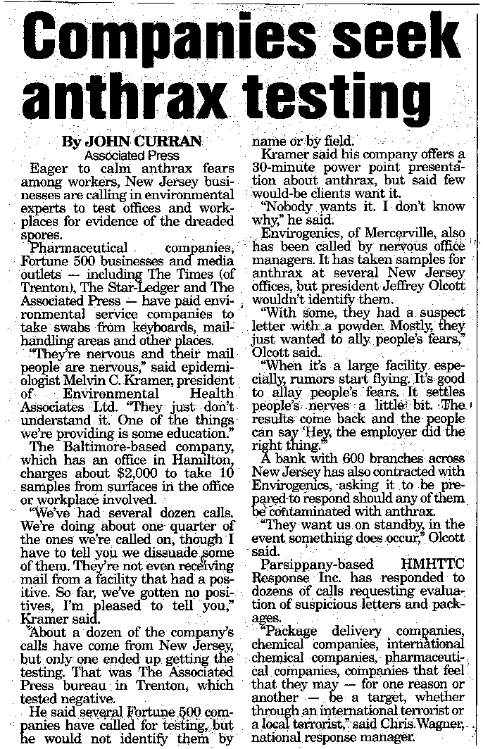 Companies Seek Anthrax Testingby John Curran (Associated Press) - November 1, 2001.